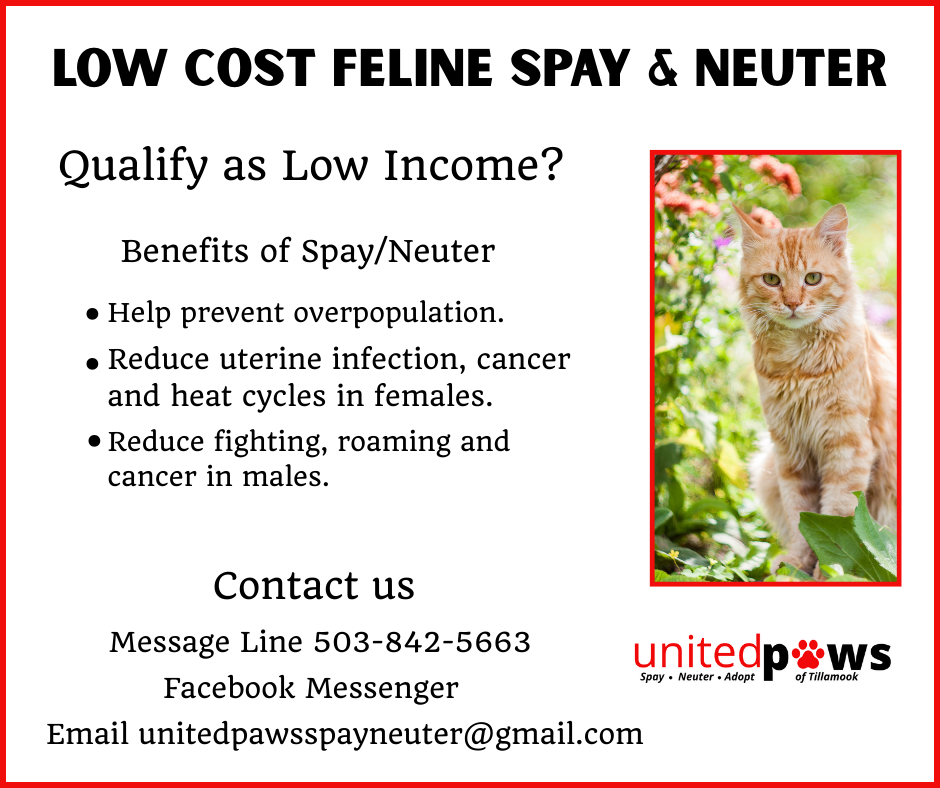 United Paws of Tillamook is a nonprofit dedicated to alleviating animal suffering by humanely addressing cat and kitten overpopulation and homelessness. We provide sliding scale spay and neuter clinics, wellness clinics, and basic veterinary services for pet guardians who are on limited incomes. We also offer support for Trap Neuter Return (TNR) efforts to help control feral cat colonies.